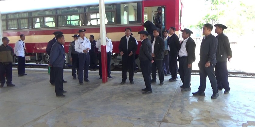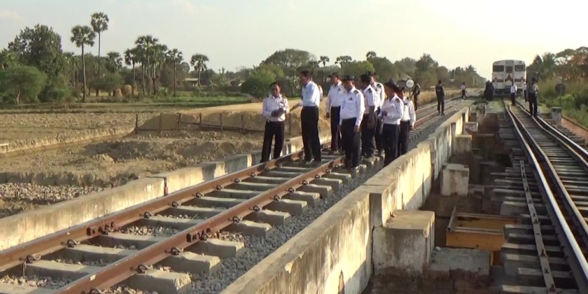 Deputy Minister for Transport and Communications U Aung Myaing, along with general managers and regional responsible officers from Myanmar Railways, inspected the progress of efforts to increase train speeds, the condition of station renovations, the construction status of new bridges along the railway line, the construction of sports fields and stadiums, the Pyin Oo Lwin diesel locomotive repair workshop, the Mandalay carriage repair workshop, the concrete sleeper factory (Myitnge), and the demolition of the abutments of the Sagaing (Inwa) Bridge and the railway approaches on both sides of the bridge, from February 9 to 11.
