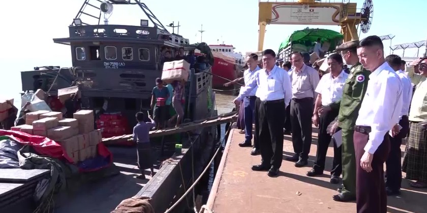 Later, the Chief Minister and party visited the Sittwe Multipurpose Port to inspect the arrival of consumer goods transported to Rakhine State by ships and vessels under the supervision of the National Disaster Management Committee and coordinated by the Rakhine State Government and the Yangon Region Government.