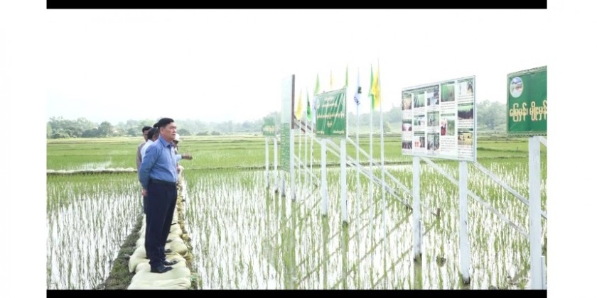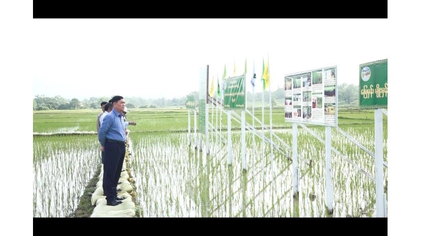 First, the Chief Minister and party observed the demonstration of cultivating Hsinthukha paddy strain which is high in yielding to meet the target of 100 baskets yielding per acre in Kin Taung Village in Taung Goke Township. At demonstrated cultivation, the staff officer of Township Agriculture Department clarified the completion of seed production growing, status of growing monsoon crops and monsoon paddy and the State staff officer supplemented and the Chief Minister instructed necessary matters and looked round the thriving of model plot. Next, the Chief Minister met with the farmers, gave necessary instructions and provided foodstuff.
