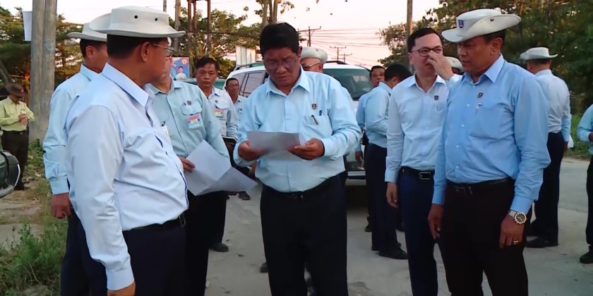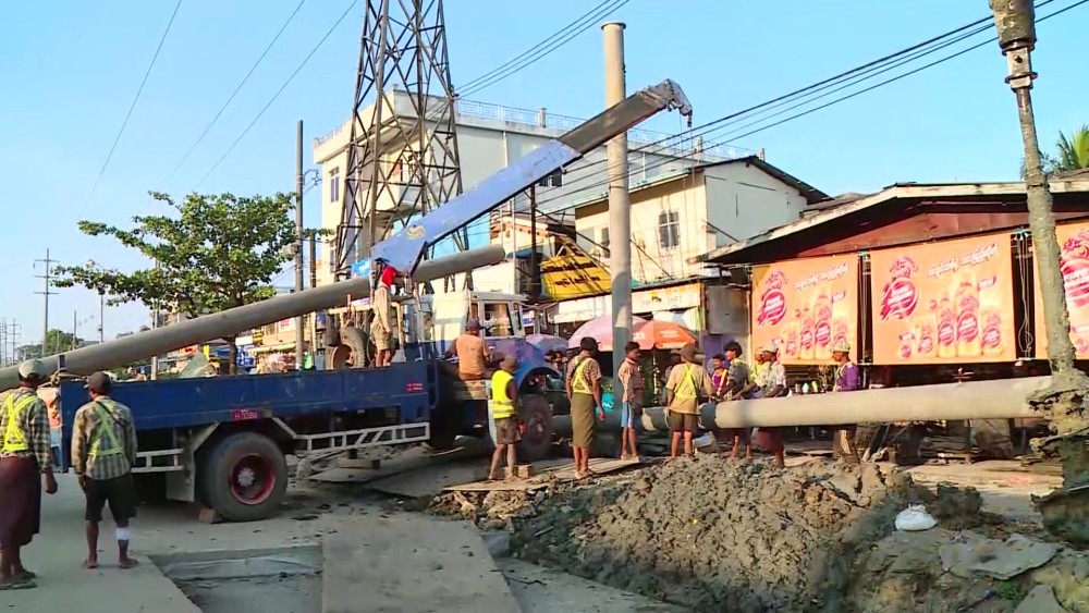 In Shwe Pyi Tha Township, the Union Minister and party inspected completed relocation works of 33 KV, 11KV and 400 Volt electric grids to upgrade No. 4 Road to 8-lane road, relocation of 66 KV HlawKar-Ywar Ma  electricity distribution poles near DaNyinKone  Junction, relocation of fiber cable lines along Ayeyawady Road and relocation of overlapping electric lines at Anawrahta Industrial Zone.