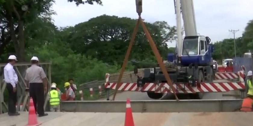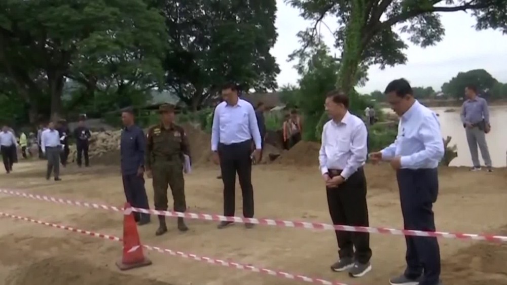 First, the Prime Minister and party inspected the damages along the old Yangon-Mandalay road caused by erosion from Sin Thay Creek. They then visited the Na Win Creek Bridge (Asone) to assess damage and repair work, including the installation of a temporary Bailey Bridge.