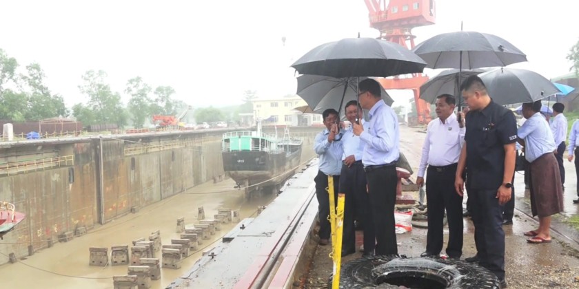 In the afternoon, they proceeded to Myanmar Shipyards, where the Managing Director briefed them on current operations such as vessel construction, repair works, construction of coastal commercial vessel, and financial issues. The Union Minister instructed that operations be expedited and urged cooperation from related departments under the Ministry to support Myanmar Shipyards' needs.