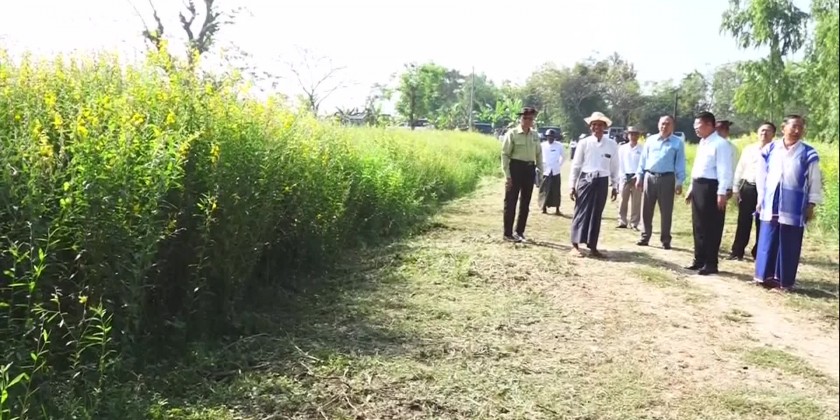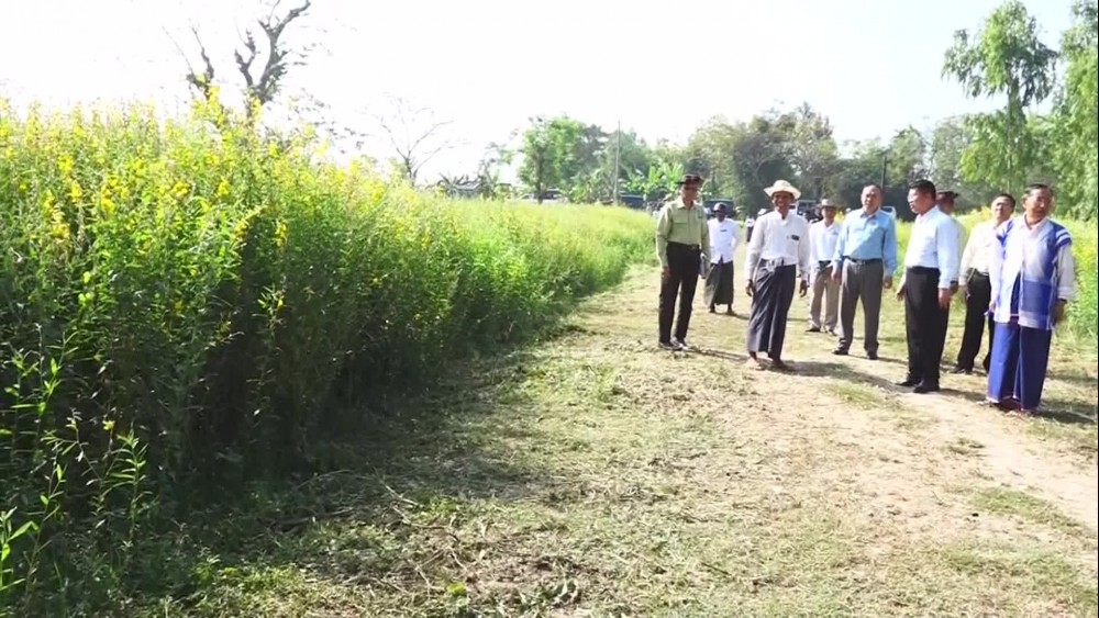 Member of the State Administration Council MahnNyeinMaung, accompanied by Ayeyawady Region Chief Minister U Tin Maung Win and officials, visited Mayae Ohnpinsu Village in Mawlamyinekyun Township of Labutta Districton Sunday to observe Sunn Hemp plantation.