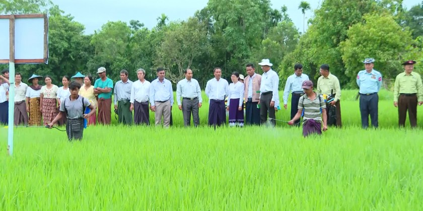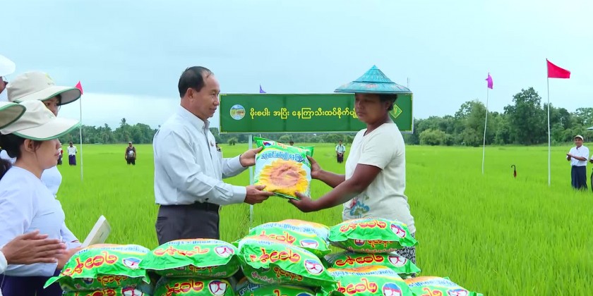 Next, the Chief Minister and party oversaw the demonstration of natural fertilizer application at a monsoon paddy model plot plantation in NarNone Village of Homalin Township and provided Yezin sunflower seeds to the farmers.