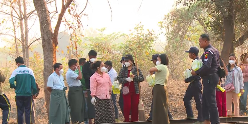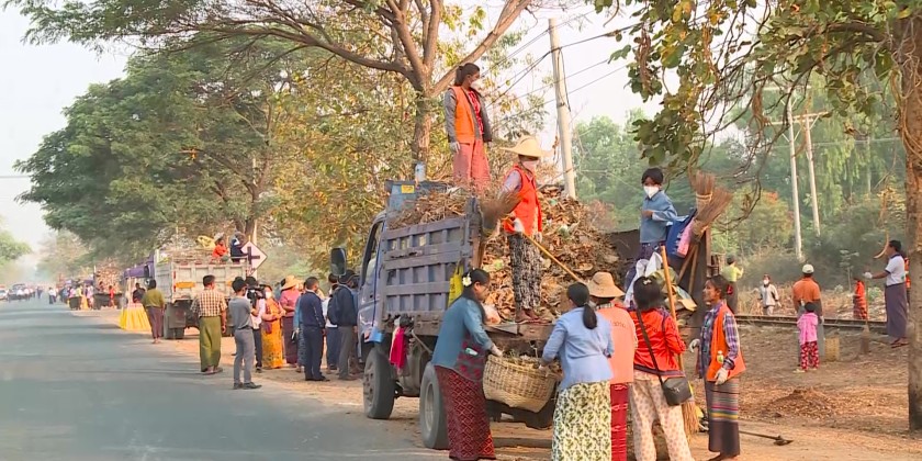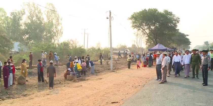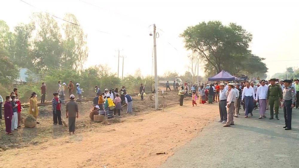 The Sagaing Region Chief Minister U Myat Kyaw, together with region government members, region-level departmental officials, and relevant authorities, observed the ongoing cleaning activities carried out by a combined force of over 500 people along the Union Road railway tracks from Kokko Street to Badauk Street in Myothit Ward, Monywa Township, on March 7.
