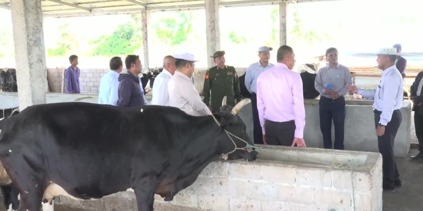 During the inspection at dairy farming zone in Kon Lon village-tract, the Chief Minister and party oversaw the construction of disinfection gate at the entrance and exist of the farm. Upon the clarifications made by the Director of Livestock Breeding and Veterinary Department and departmental official, the Chief Minister coordinated the requirement for the development of livestock breeding sector. The Chief Minister also visited Super Seven Stars dairy farm and inspected the completion of dairy farming area.