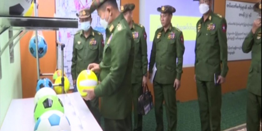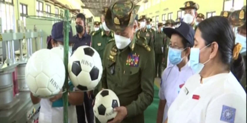 On arrival at the Tatmadaw Football Factory in Hmawbi, the Vice Senior General stressed the needs on producing various kinds of high quality footballs and volleyballs, operating of machine at full capacity, seeking market for the products, market promotion and fulfilled the needs.