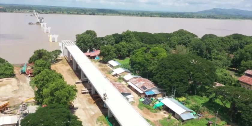 The Ayeyawaddy Bridge (Thayet-Aunglan) is designed to be 2,272.5 meters long with 8.5 meters wide lanes for vehicles and 1 meter wide pedestrian lanes on each side. The construction process in now 52 % completed.