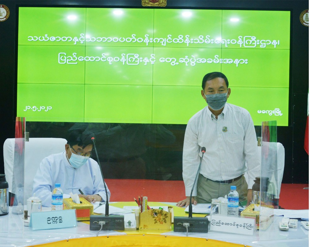 Union Minister for Natural Resources and Environmental Conservation U Khin Maung Yi held a coordination meeting with the chairman of Magwe Region Administration Council in the afternoon on 21st May regarding the plantation of trees at both sides of the roads in Magwe region, achievement of the project for establishment of village use firewood plantation, protection of toddy palm trees from extinction and sustainable development and the coordination between the ministry of natural resources and environmental conservation and the Magwe Region Administration Council.