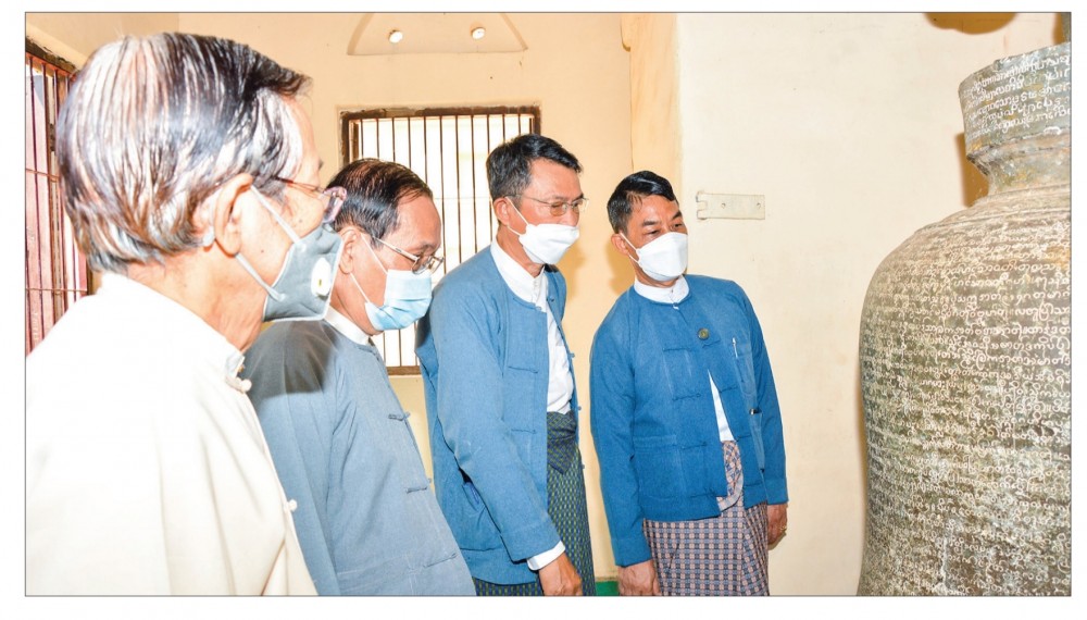 Union Minister for Religious Affairs and Culture U Ko Ko, accompanied by Deputy Minister U Tun Ohn and officials, took five precepts from Sayadaw Baddhanta Pinya Thiri Chair of the Township Sangha Nayaka from Maha Visuddha Rama Tike Thit, NyaungU Township on 10 September. The Union Minister donated K5 million and offertories and presented religious affairs. Afterwards, the Union Minister inspected the strength of Shwesigon Pagoda, King Bayint Naung’s Bell which is one of the world’s heritage items, a “Memory of the World”, and King Kyansittha’s Stone Inscription, and instructed requirements.