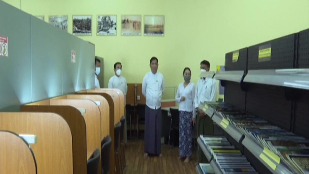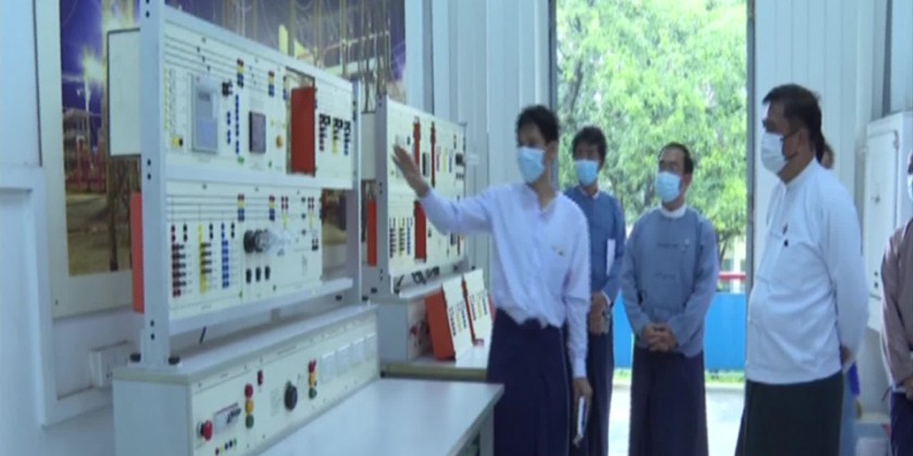 The Union Minister and officials viewed learning of the students, practical and computer rooms, teaching aid, library and workshop and construction tasks of the Government Technical Institute (Thanlyin).