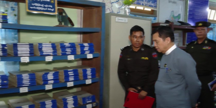 From there, the Union Minister visited the township offices of the Department of Immigration and Population in Wakema and Myaungmya Townships. He observed the staff carrying out Phase 3 of the Pan Khin Project, which aims to provide household population lists and citizenship scrutiny cards to residents who have lost or damaged theirs, as well as to those who have not yet received them.