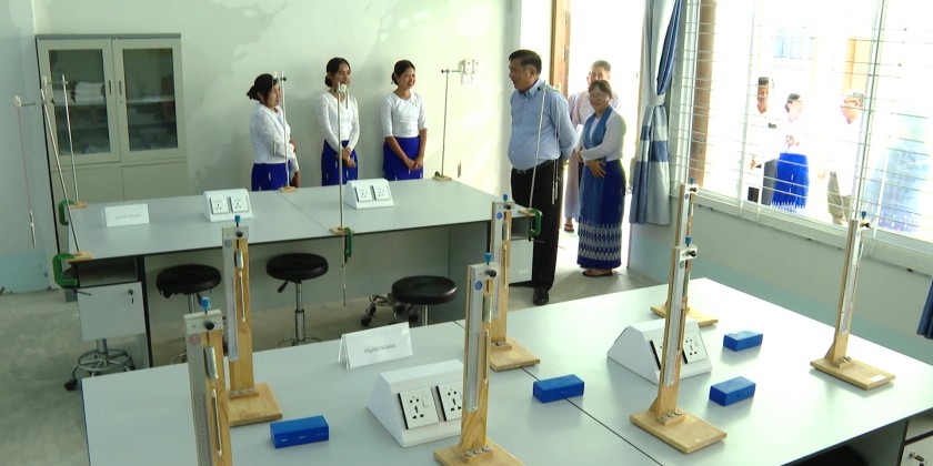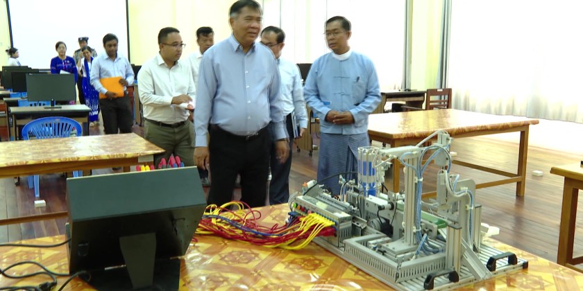 On arrival at Government Technical Institute (Yamethin), the Union Minister oversaw the buildings, classrooms, computer rooms, library, workshops and futsal ground.  He also inspected the teaching aids at the workshops and fulfilled requirements to ensure convenient learning environment for the students.