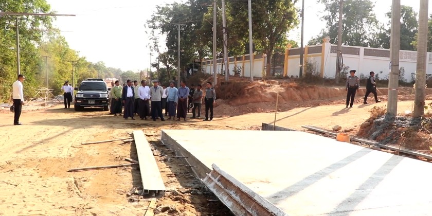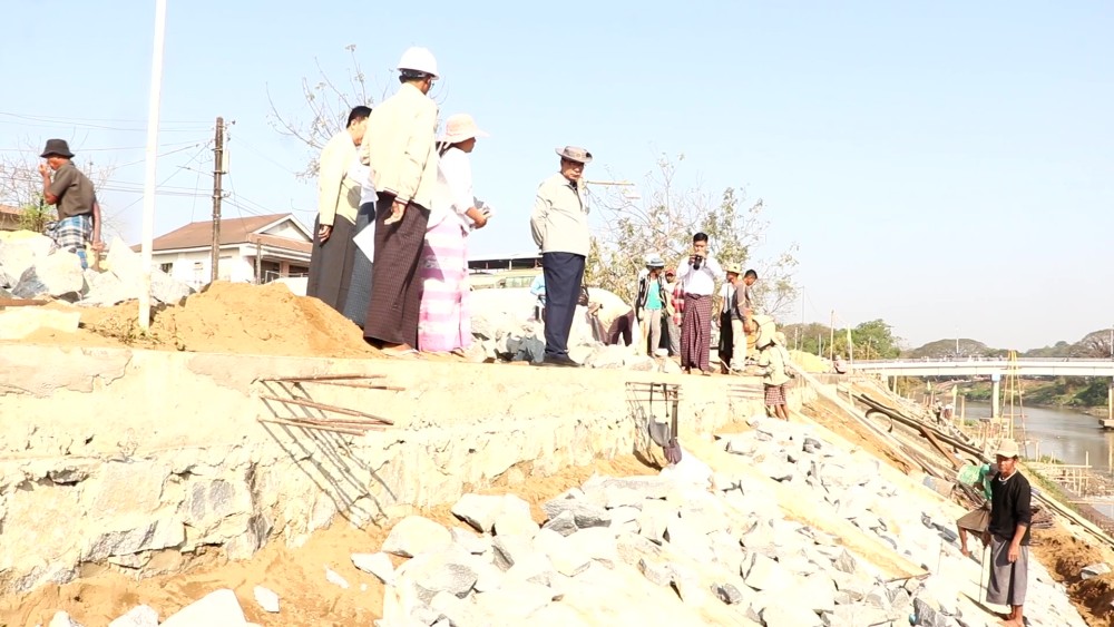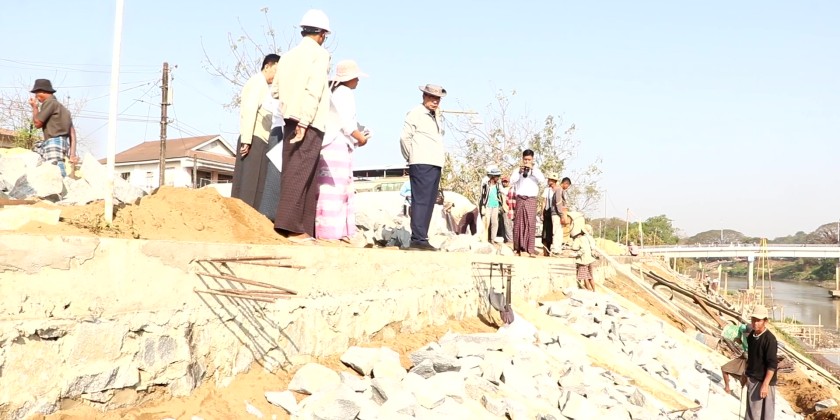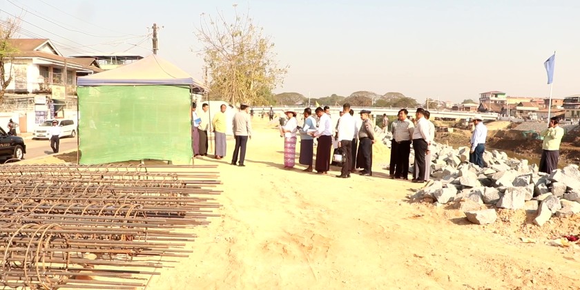 Bago Region Chief Minister U Myo Swe Win conducted an on-site inspection of urban cleanliness and beautification tasks within Bago on January 28. First, Chief Minister U Myo Swe Win visited the Bago River Crossing Bridge in the center of Bago City. He inspected the ongoing construction of a stone/concrete retaining wall, which is being built on a bored pile foundation to enhance the bridge's aesthetics and prevent riverbank erosion.