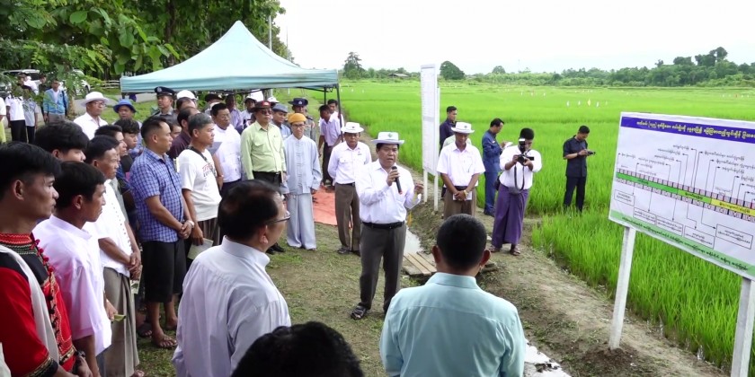 After that, the State Chief Minister and party arrived in Nant Kone Village tract in Mongpyat Township where they viewed the presentation of the plan to add fertilizer to the seeds clarified by an official from the department of Agriculture and encouraged the demonstration of collective scattering fertilizer and mixing method of fertilizer.