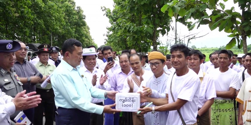 Later, the State Chief Minister presented 10 million kyats for the construction of Haung Hin village road and 15 million kyats for construction of Khat Tan village bridge to the officials.