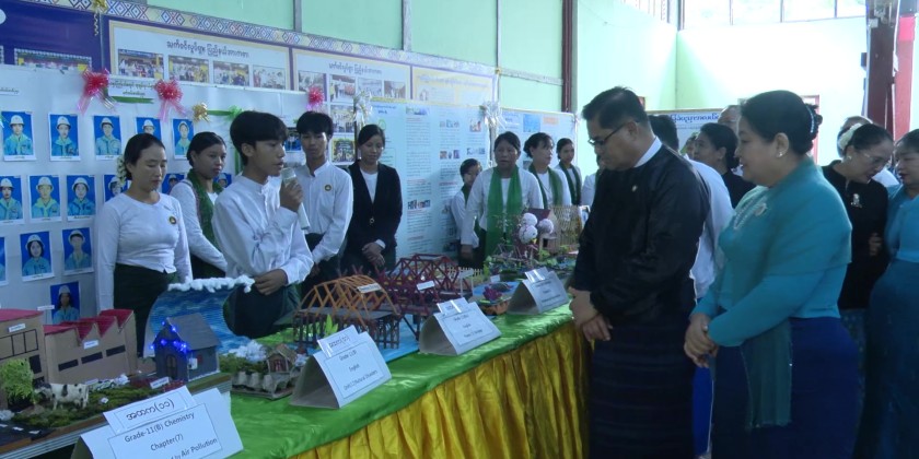 The Chief Minister, his wife, and officials then toured the book and magazine exhibitions and the displays of educational achievements by students from various basic education schools.