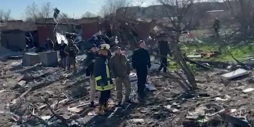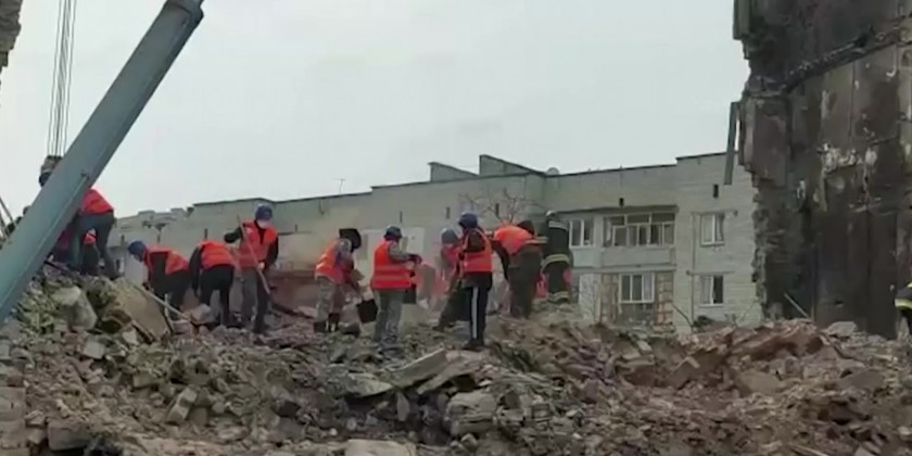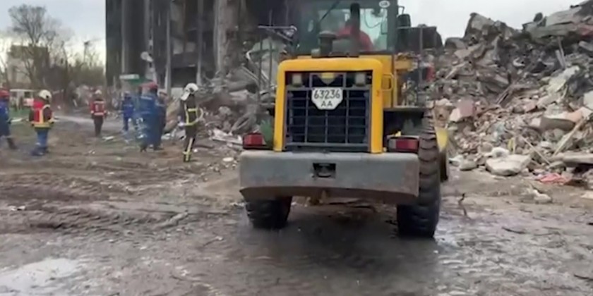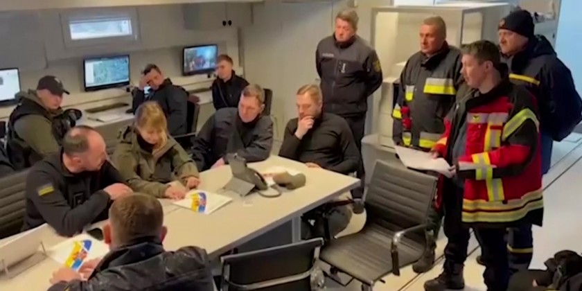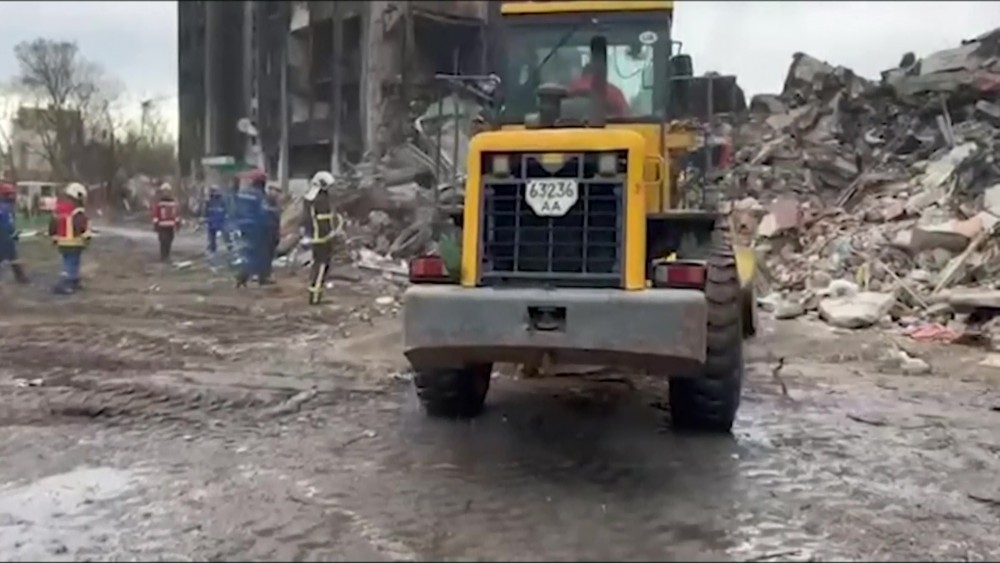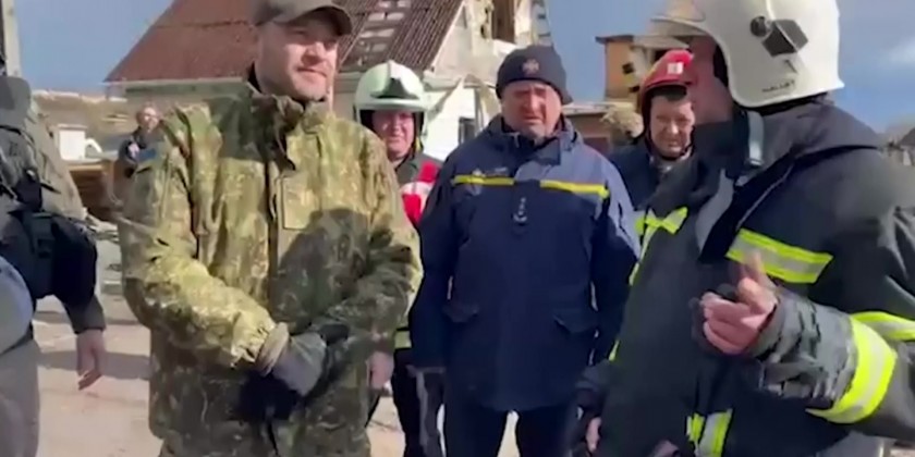 In footage released by Ukraine's State Emergency Service, the minister was seen observing the damage done to the town following Russia's military operation and he watched on as emergency service workers carried out search and clearing operations.