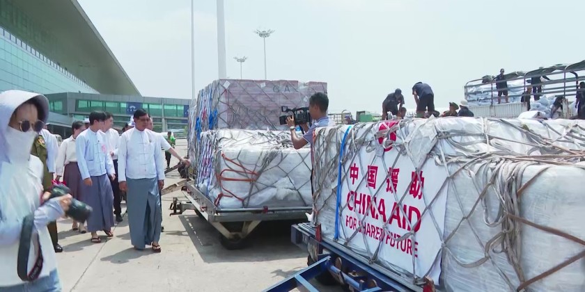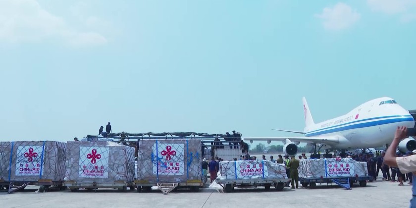 An aircraft, carrying humanitarian aid materials and medicines donated by the Chinese government and people for the earthquake victims, arrived at Yangon International Airport on Thursday.
