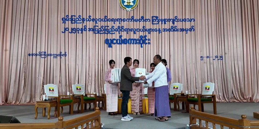 Subsequently, Dr. Aung Nay Myo, Pro-Rector of Taunggyi University, gave a speech of thanks. Chief Minister U Aung Aung then presented commemorative gifts to the moderator and the speakers, which were received by the officials. He also presented sports equipment to Taunggyi University, which was accepted by the Pro-Rector, Dr. Aung Nay Myo.