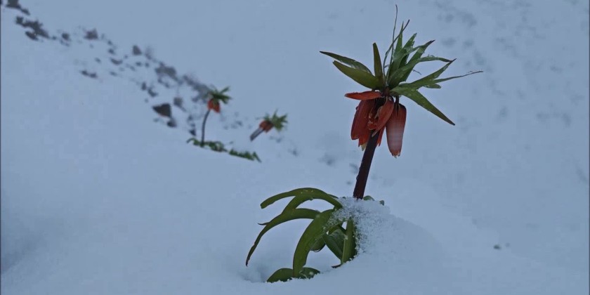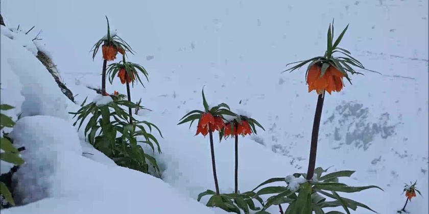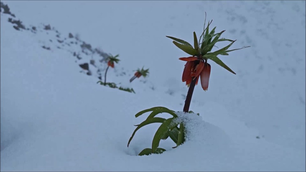 A unique tulip, known as Crown Imperial is now in bloom in the mountainous areas of eastern Türkiye as spring has arrived. Red inverted tulips, which bloomed with the arrival of spring, remained under the surprisingly falling snow cover in mid-April.