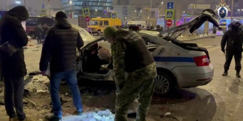 A police officer was killed and two others wounded when a man detonated an explosive next to a patrol car on the station square. The man approached officers in the vehicle before triggering the device. TASS reported the patrol car was badly damaged but did not catch fire. Police secured the area and sent multiple ambulances. The attacker died at the scene, the Russian Interior Ministry confirmed. No information has been released regarding the type of explosive used.