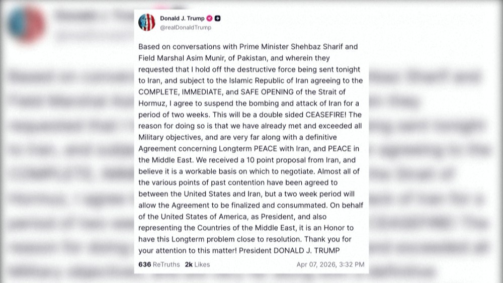 Trump announced Tuesday he has agreed to "suspend the bombing and attack of Iran for a period of two weeks." The decision is "subject to" Iran agreeing to the complete, immediate and safe opening of the Strait of Hormuz, he wrote on social media.