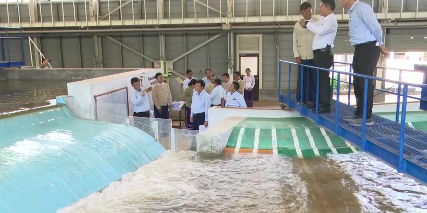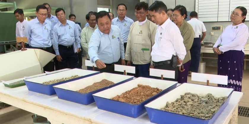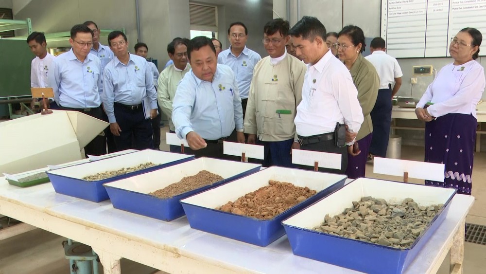 Union Minister for Agriculture, Livestock and Irrigation U Min Naung inspected the Irrigation Development Training Division in Bago Township and heard reports on work implementation of the division with the support of JICA, training, operations of soil testing laboratory and water quality testing laboratory, construction equipment quality testing, construction worksite quality maintenance and Hydraulic laboratory operation.