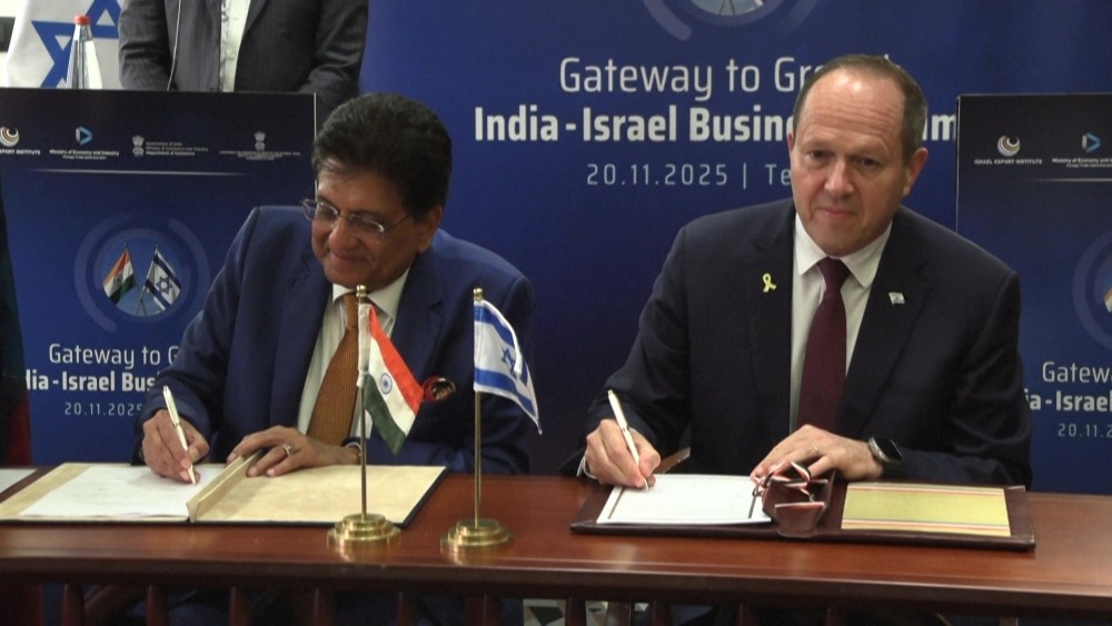 Israeli Economy and Industry Minister Nir Barkat and his Indian counterpart Piyush Goyal signed agreements on Thursday, during the India-Israel Business Summit in Tel Aviv. Goyal underlined that the two nations have "unlimited possibilities and potential" to expand economic engagement. He is leading a 60-member business delegation to Israel. Goyal is set to travel to Jerusalem on Friday as part of his ongoing visit to further strengthen bilateral economic ties.