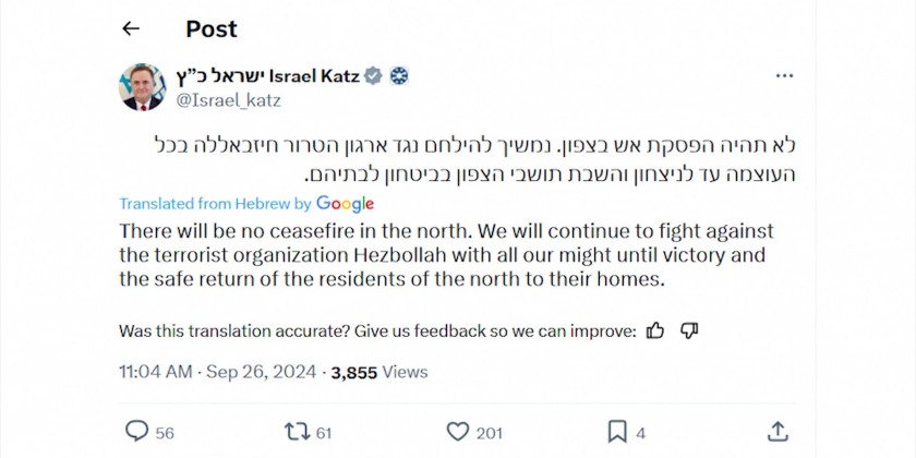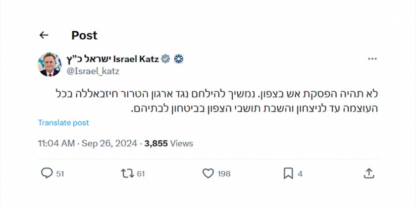 He said in a statement on the social media that “There will be no ceasefire in the north. They will continue to fight against the Hezbollah terrorist organization with all their strength until victory and the safe return of the residents of the north to their homes”.