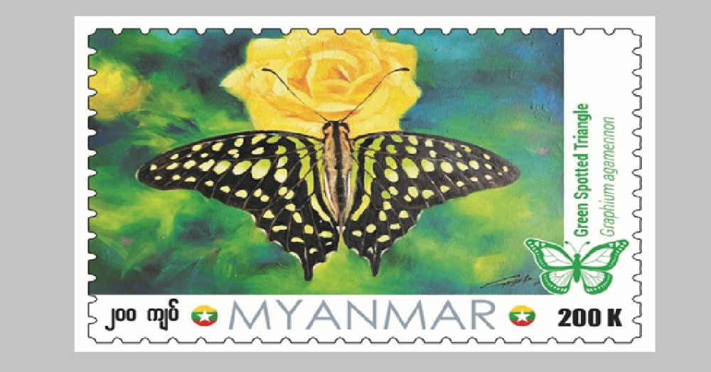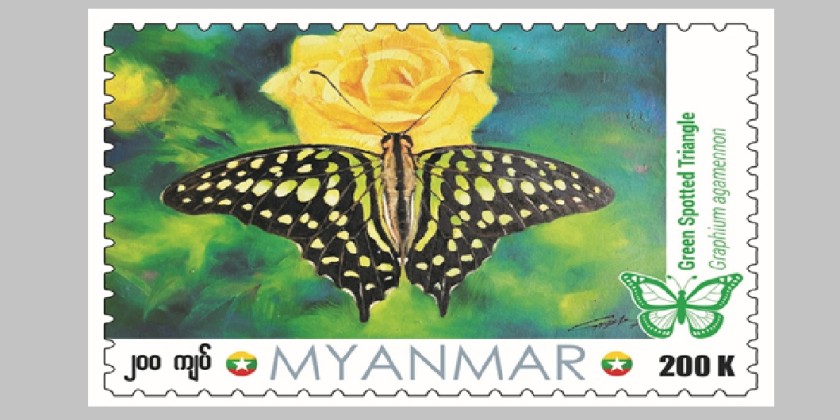 The Myanmar Post under the Ministry of Transport and Communications will issue a new postage stamp (worth 200 kyats each) Myanmar Post, under the Ministry of Transport and Communications, will issue a new K200 postage stamp featuring the “Green Spotted Triangle” butterfly, a species native to Myanmar and recorded by the Ministry of Natural Resources and Environmental Conservation and sell it starting from 9:30 am on February 1st, 2025, at the Central Post Offices in Nay Pyi Taw, Yangon and Mandalay and other post offices in each region and State simultaneously.