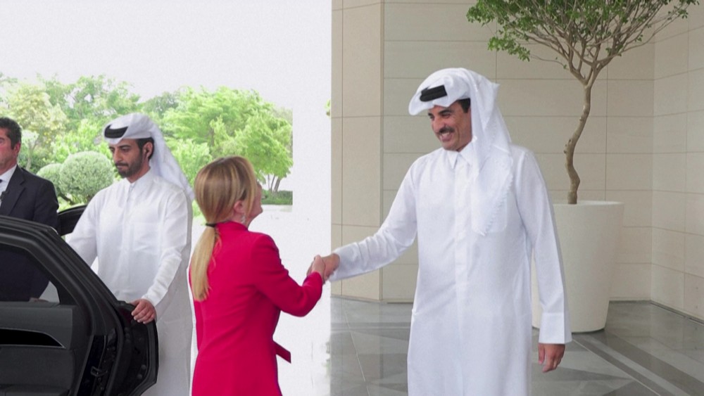 Italian Prime Minister Giorgia Meloni met Qatar’s Emir Sheikh Tamim bin Hamad Al Thani in Doha on Saturday to discuss the energy crisis due to Mideast conflicts.