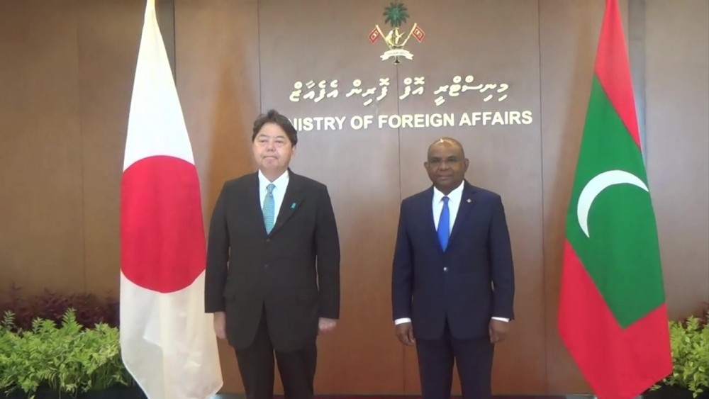 Japanese Foreign Minister Hayashi Yoshimasamet Maldives Foreign Minister Abdulla Shahid in the Maldives' capital, Male, on Sunday. They have confirmed that their countries will work together to realize a free and open Indo-Pacific.