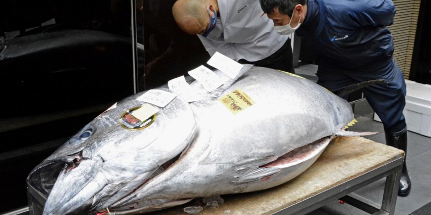 Tokyo's Toyosu fish market holds its first tuna auction of 2021 on Tuesday. Before dawn, buyers in rubber boots inspect the quality of giant fresh and frozen tunas by examining the neatly cut tail end with flashlights and rubbing slices between their fingers. Previously in Tsukiji -- the world's biggest fish market and a popular tourist attraction in an area packed with restaurants and shops -- the market moved in October 2018 to Toyosu, a former gas plant a bit further east. A tuna was sold for 165 thousands euros on Tuesday at the first auction. The price is far cry from the record figures of previous years. In 2020, self-styled "Tuna King" Kiyoshi Kimura paid out nearly 1.5 million euros.