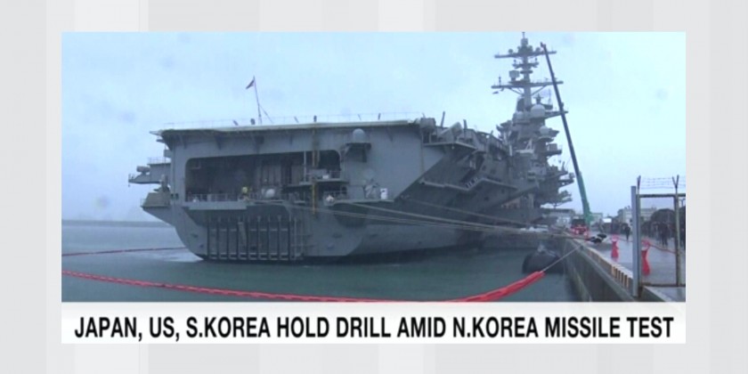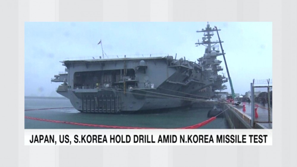 South Korea's Joint Chiefs of Staff said seven types of drills were held, including a missile defense operation at sea and response to cyberattack, adding that the countries completed the drill in bad weather, showing their strong will to develop trilateral security cooperation.