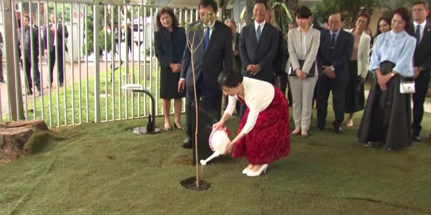 The princess planted a tree in the garden to commemorate the 130th anniversary of establishing diplomatic ties between Japan and Brazil. The princess expressed her deep respect for the people from Japan and their descendants, for their tireless efforts despite the many difficulties they faced, and for the contribution they have made to Brazilian society.