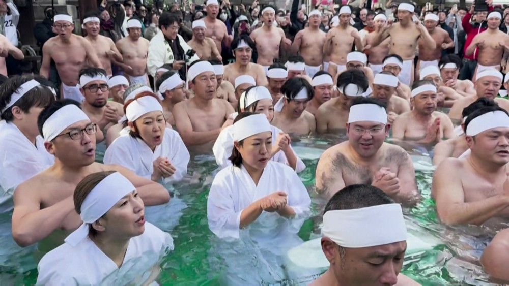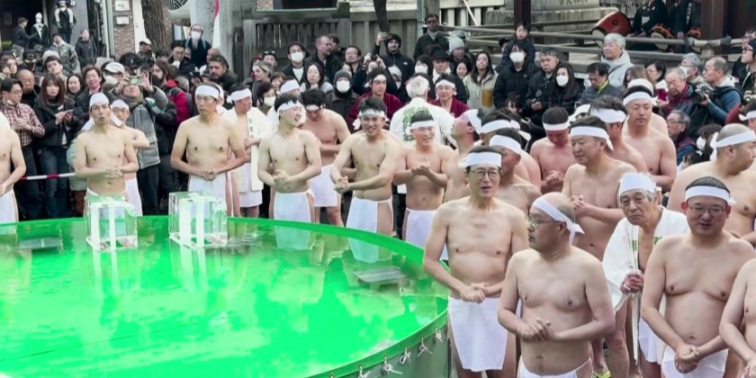 During a New Year ritual at Teppozu Inari Shrine in Tokyo, roughly 80 Shinto devotees immersed themselves in an ice bath, as part of a ritual meant to purify the soul and pray for the new year. The ritual originally began in 1955, inspired by one of the shrine's former chief priests who splashed cold water onto himself while praying for the local community's well-being.