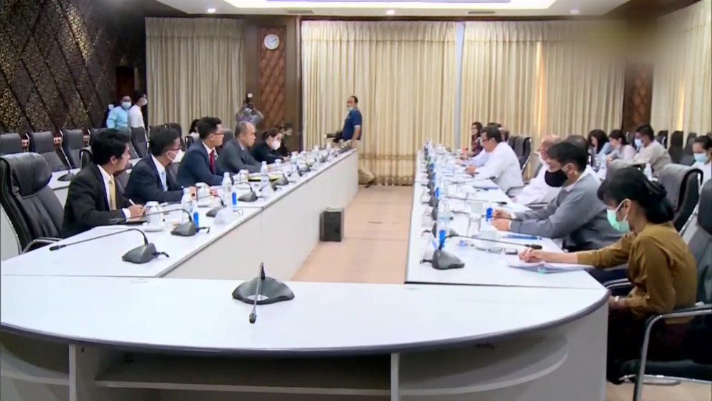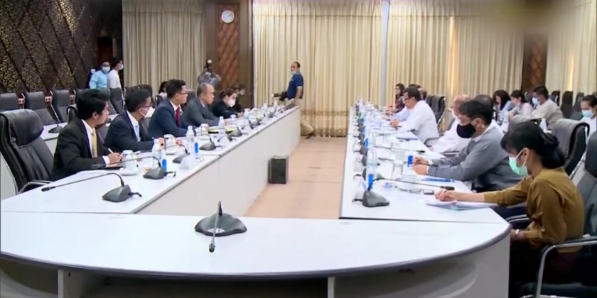 Members of the Task Force for the facilitation of ASEAN Humanitarian Assistance to Myanmar through the AHA Centre Deputy Minister for Foreign Affairs U Kyaw Myo Htut, Deputy Minister for Health Dr. Aye Htun and Deputy Minister for Social Welfare, Relief and Resettlement U Aung Tun Khaing met Cambodia Delegation led by Secretary of State for the Ministry of Foreign Affairs and International Cooperation and Head of the office of the Special Envoy of the ASEAN Chair Dr. Kung Phoak in Nay Pyi Taw on Thursday.