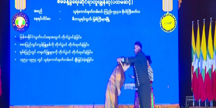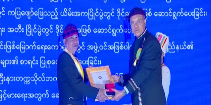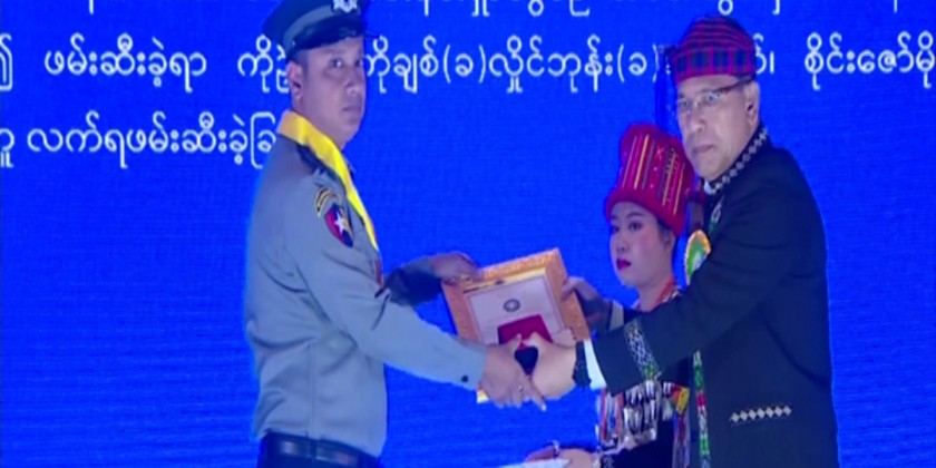 SAC members Jeng Phang Naw Taung, U Moung Har, U Sai Lon Seng and U Shwe Kyein presented the awards for excellence in management (first) while Union Ministers the awards for excellence in management (second) and (third), awards for excellence in business (first), (second) and (third) and certificates of honour and the Kachin State chief minister, the commander and deputy ministers the cash prizes and certificates of honour to the students who won in higher and basic education level essay and poem competitions.