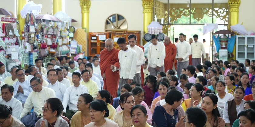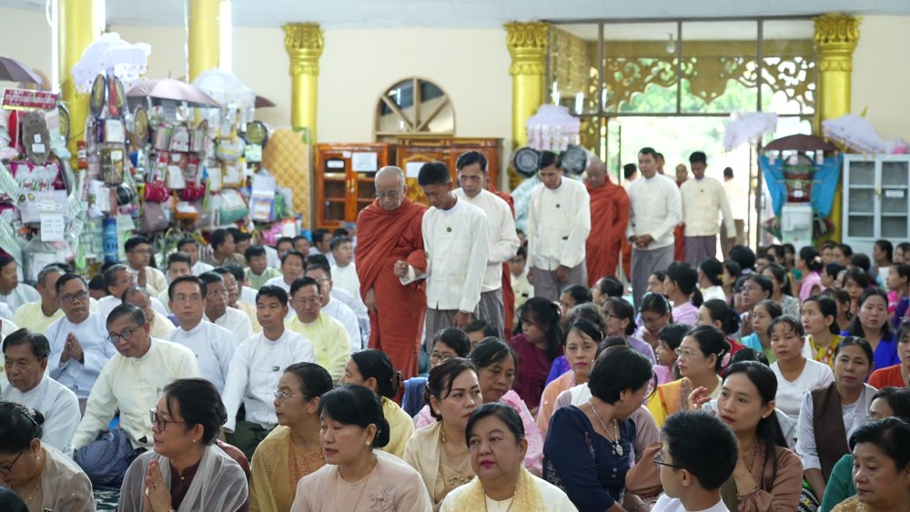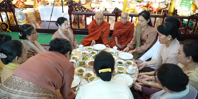 Subsequently, an Anumodana discourse was listened to, and the act of pouring water was performed to share the merits of all the offerings. A Day meal was then offered to the invited venerable Sayadaws.