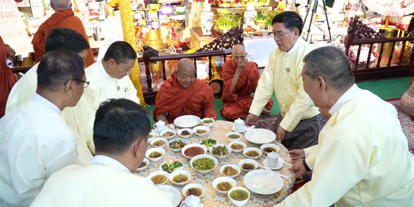 First, the Chief Minister U Tint Lwin and the attendees received the Five Precepts from the Presiding Sayadaw of the Magway Township Sangharama Monastery. They then listened to the Paritta suttas recited by the members of Sangha. Following this, the Magway Region Chief Minister and senior officials offered the Kathina robes, accompanying offertories trees, and other donated items to the venerable Sayadaws.