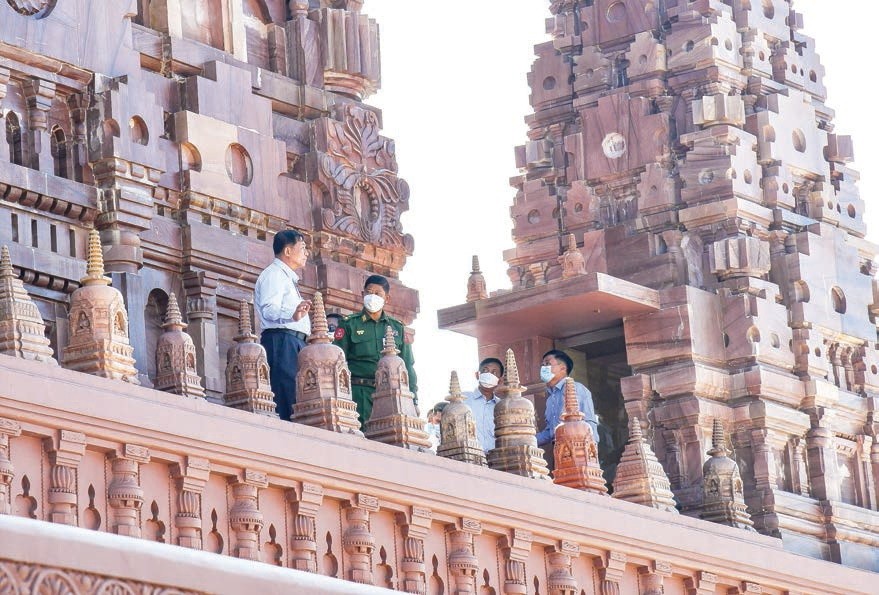 Chairman of the State Administration Council Prime Minister Senior General Min Aung Hlaing and party on Tuesday visited the Buddha Park near PanKwe Village, about 15 miles southeast of KengTung. The Prime Minister and party paid homage to Abaya Raja Muni Buddha Image and donated flowers and water. They also viewed the life stories of Buddha, curving in marble slabs. The Prime Minister later inspected the Sky Train Project which will link Buddha Park and LoiMwe Hill Resort.