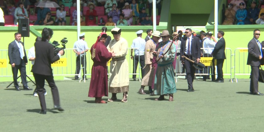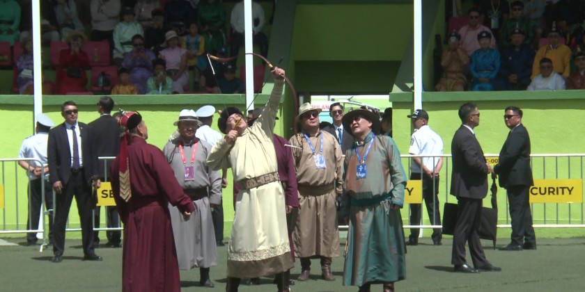 The President of Mongolia, Khurelsukh Ukhnaa and King of Bhutan His Majesty Jigme Namgyal Wangchuck shot sound arrows during their visit to the National Archery Square on 10th July.
