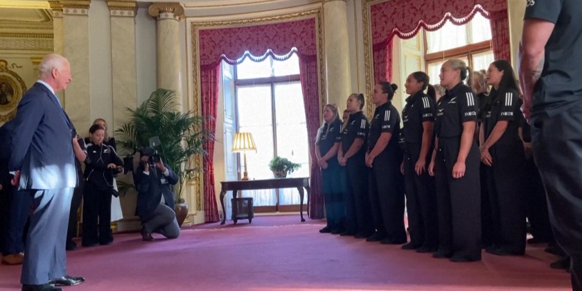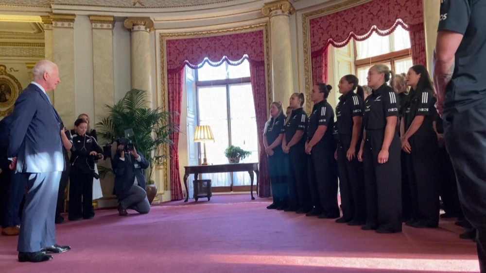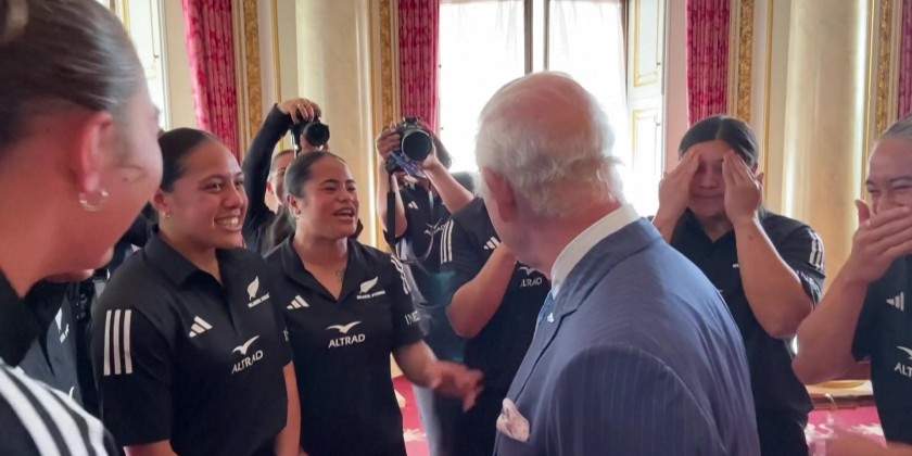 A New Zealand women's rugby player surprised King Charles III after asking him for a hug at a Buckingham Palace reception. The King accepted her request, and was then affectionately mobbed by a group of players.