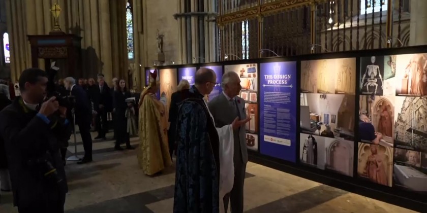 After attending a service at the city's cathedral, the couple unveiled the statue of the king's mother, who died in September after 70 years on the throne. Designed and carved by stonemason, Richard Bossons, the statue sits on the outside of the building.