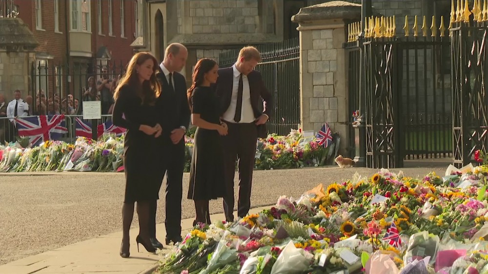 Prince William and wife Kate made a surprise joint appearance with Prince Harry and wife Meghan outside Windsor Castle on Saturday. The couples warmly greeted a large crowd gathered to remember their long-reigning monarch, Queen Elizabeth II.