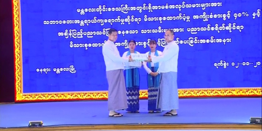 Union Minister for Labour U Aung Kyaw Hoe attended a ceremony in Mandalay to provide family support benefits for insured workers affected by natural disasters and for their children’s education.