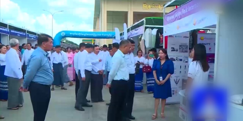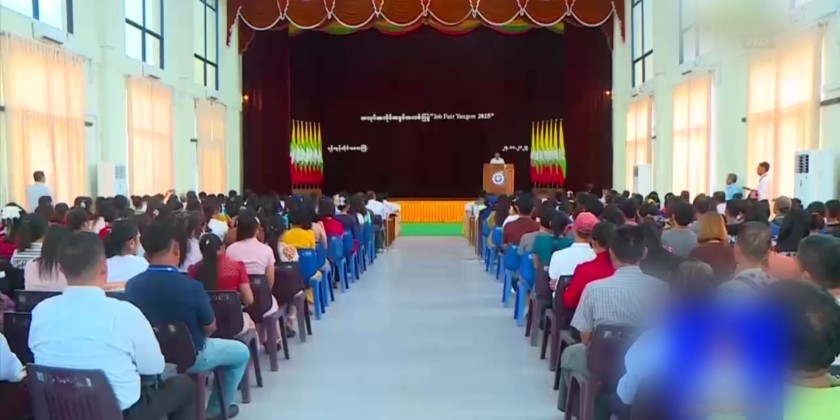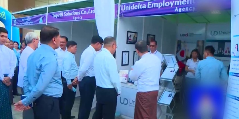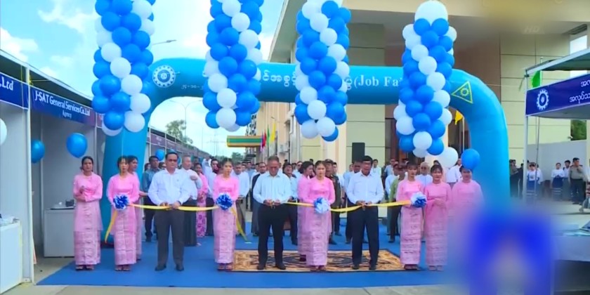 In the afternoon, Union Minister U Aung Kyaw Hoe attended and addressed the Job Fair ceremony held within Yangon Region. Following this, the Union Minister for Labour and the Yangon Region Chief Minister cut the ribbon to open the Job Fair.