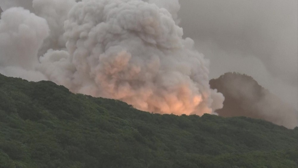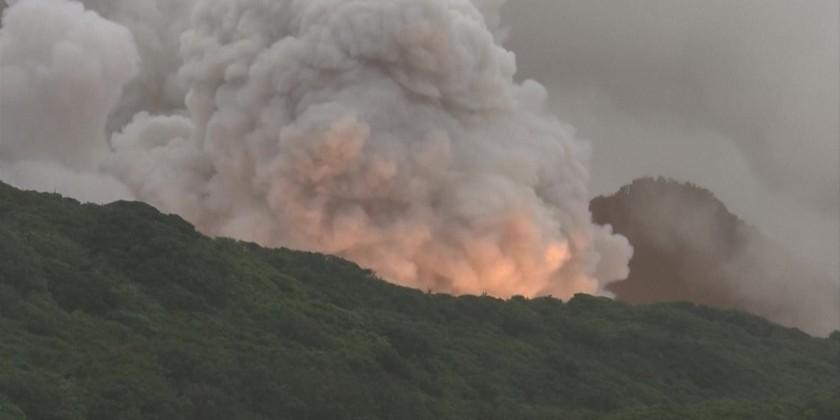 Towering balls of fire and white fumes rose from the Tanegashima Space Center. NHK said the fire happened during a combustion test that began at around 8:30 a.m.