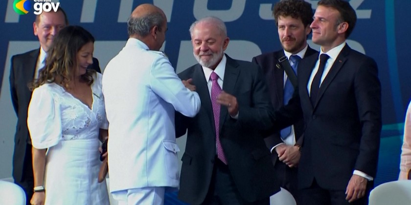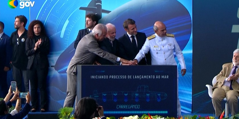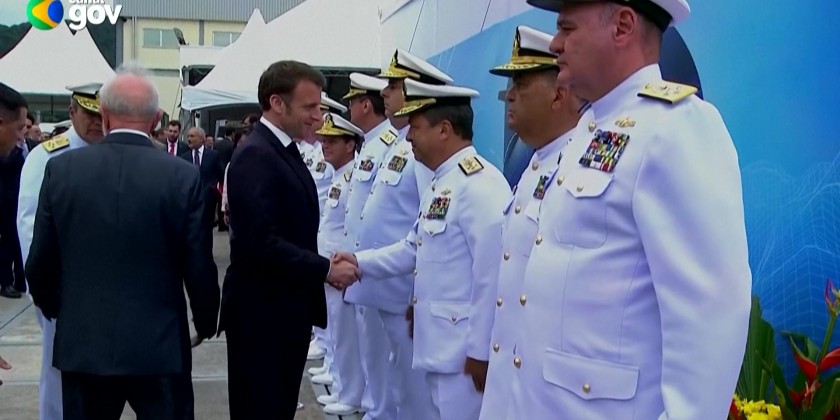 French President Emmanuel Macron and Brazilian President on Wednesday celebrated the launch of Brazil's third French-designed submarine, which will help secure the country's immense coastline.
